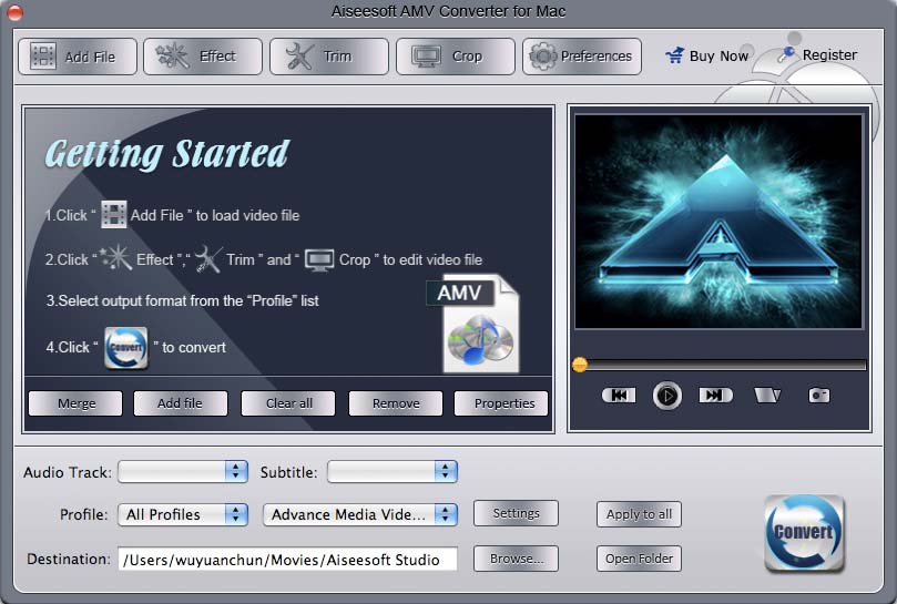 Aiseesoft AMV Converter for Mac, the most professional Mac AMV Video Converter, provides users with the best solution to convert any video to AMV format on Mac. And the output AMV video can keep the original video quality. Also this AMV Converter for Mac can help users customize output video effect. For instance, it allows users trim video, crop video frame, watermark video, modify video effect, and even join several videos together.