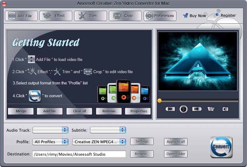 Aiseesoft Creative Zen Video Converter for Mac is able to convert almost all video formats to your Creative Zen on Mac. That is to say, this magic converter can convert MPG, MPEG, MPEG2, VOB, MP4, M4V, HD videos to Creative Zen MP4, AVI, MPG videos and extract audio from video to Zen MP3, M4A, WMA and WAV audio formats on Mac. You can edit your own videos as your style, such as, video cropping, movie trimming, watermark setting to get a personalized video.