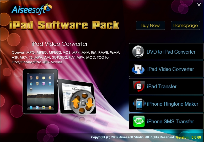 Built with a powerful inner core, Aiseesoft iPad Software Pack can convert any popular video format to iPad/iPad 2/iPhone compatible formats with speed and precision.