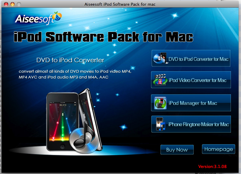Aiseesoft iPod Software Pack for Mac is a highly recommended tool, for it contains four excellent Mac iPod softwares: iPod Video Converter for Mac, iPod Manager for Mac, iPhone Ringtone Maker for Mac. You can convert any video/audio formats on Mac to iPod, backup the audio, video files on iPod to Mac and import audio, video files or folders from Mac to your iPod without iTunes. Moreover, you are able to create iPhone ringtones by the iPhone Ringtone Maker for Mac. You have many video or audio formats to choose as sources.