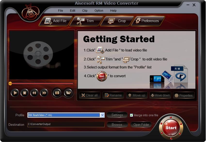 Aiseesoft RM Video Converter is a professional RM Video Format Converter to convert various video formats to RM/RMVB video formats with super fast speed and high quality. With advanced conversion technology, Aiseesoft RM Video Converter also provides you with a series of video editing functions, such as cropping video size, trimming a clip of video, watermarking video and merging several videos. You can set encoding parameters including resolution, bitrate, frame rate, aspect ratio to get the best video quality.