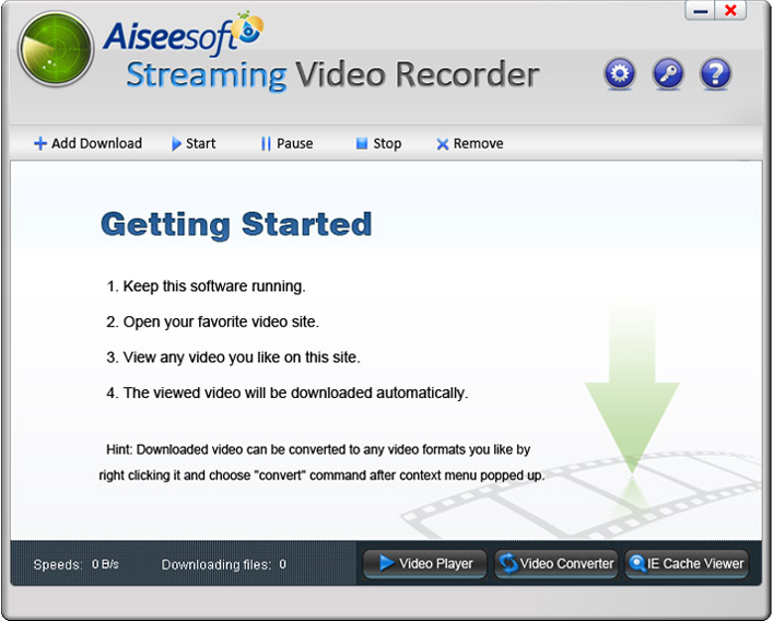 Aiseesoft Streaming Video Recorder is specially designed for online streaming video fans to quickly find and download streaming video files from YouTube, Google Video, Yahoo Video, PBS, ESPN, Adobe TV and other websites.